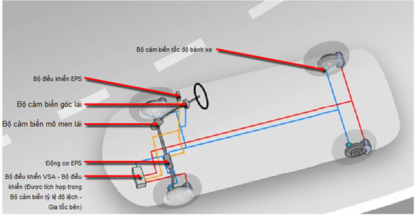 Hệ thống điều khiển của EPS Thích ứng Chuyển động bao gồm các cảm biến và các bộ điều khiển như hình vẽ dưới đây. Bộ mô đun điều khiển VSA xác định chuyển động của xe dựa trên thông tin gửi từ Cảm biến tốc độ bánh xe, Cảm biến góc lái và các thông tin đầu vào khác để điều khiển EPS.