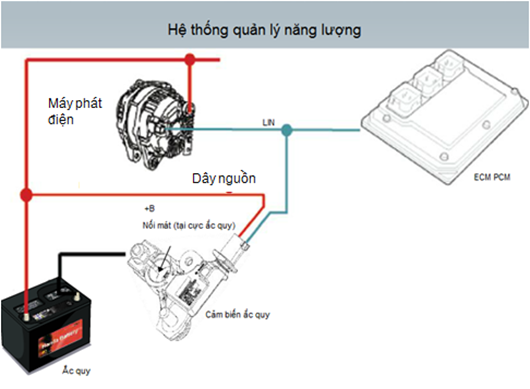 – Hệ thống này gồm một Cảm biến dòng điện của ắc quy được gắn ở cực âm, và hai dây điện trong đó: một dây cung cấp nguồn cho cảm biến, và dây thứ hai gửi dữ liệu đến ECM/PCM (mô đun điều khiển động cơ/ mô đun điều khiển truyền động). Dựa trên dữ liệu này, ECM/PCM gửi lệnh nạp điện cho ắc quy đến máy phát điện.